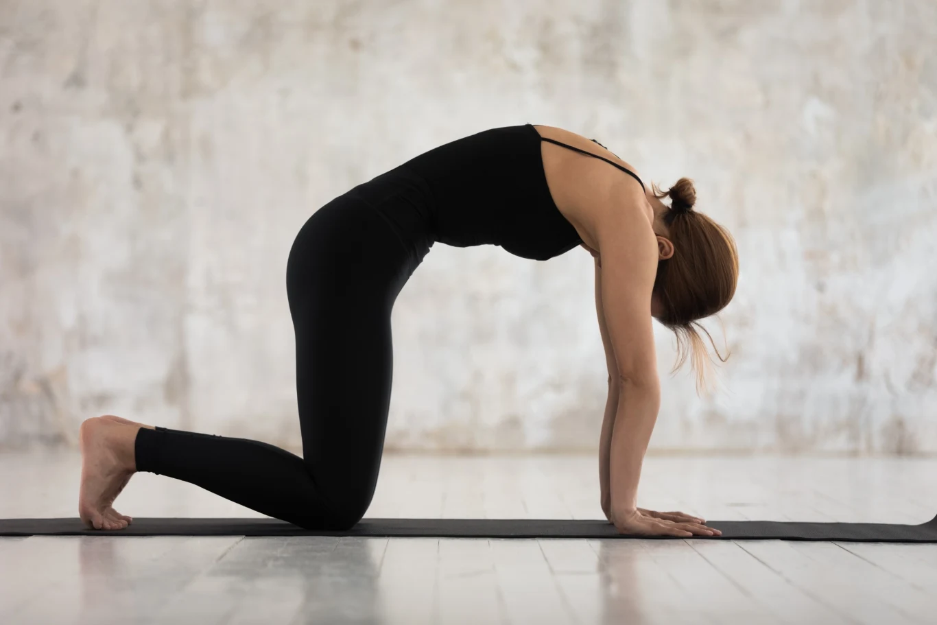 - Z wydechem zaokrąglij plecy, chowając głowę między ramiona i unosząc kręgosłup w górę (koci grzbiet).